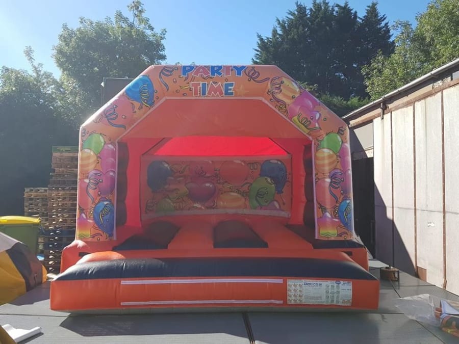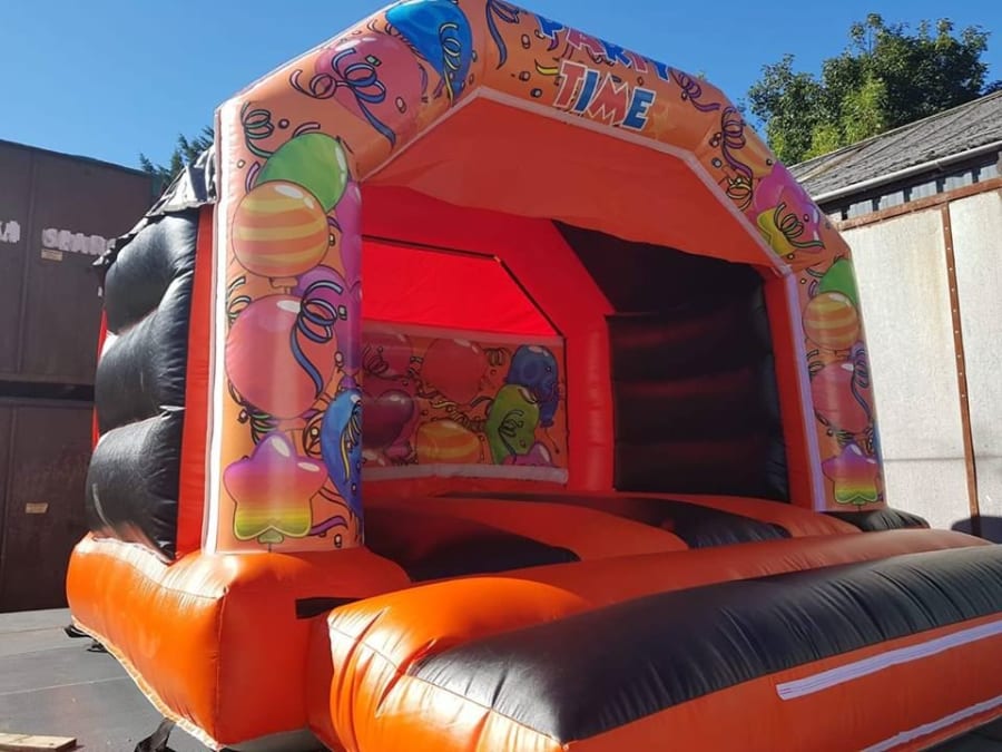 12ft x 12ft Orange/Black bouncy castle this is a low height castle at 8.6ft so ideal for indoor hires,