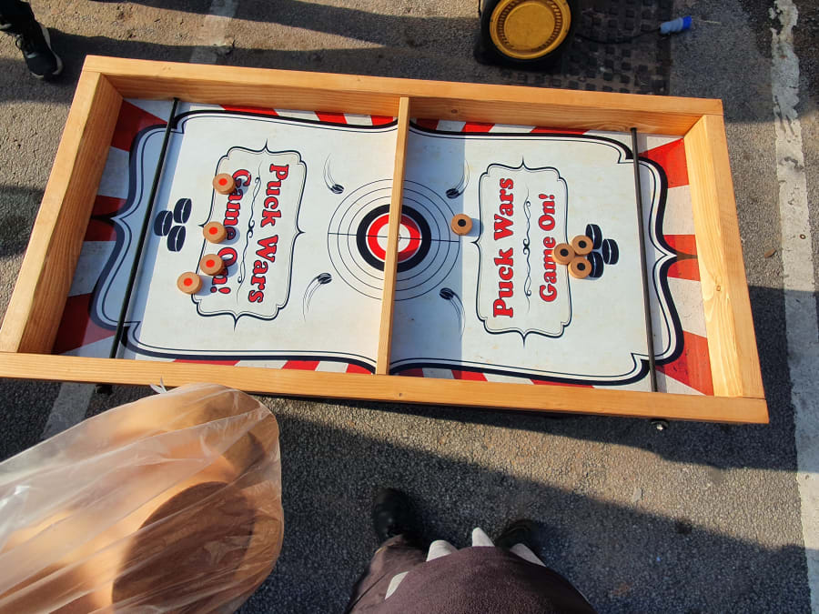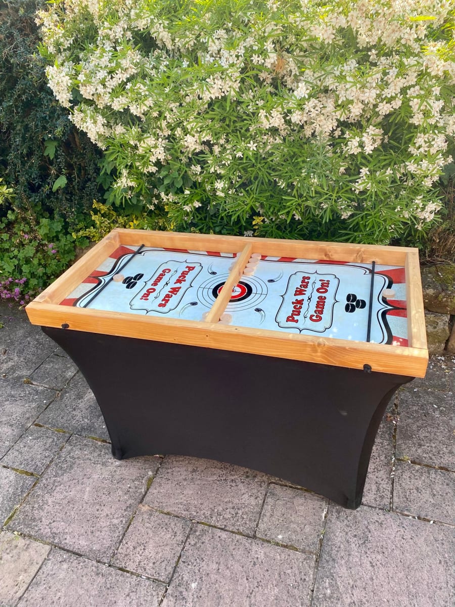 A fast paced 2 player game where you ping the wooden pucks through a small gap in the center using bungee cord. The winner is the first player to clear their side. Fast and furious!