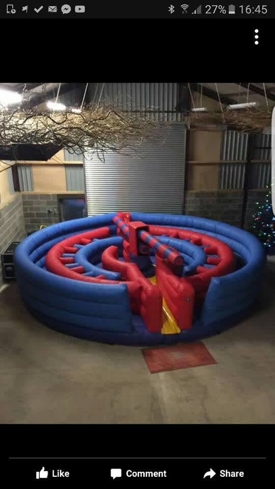 This two player game is a race through a inflatable maze battling through obstacles and avoiding the spinning arms first one back is the winner.
